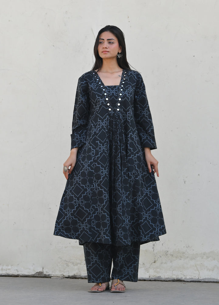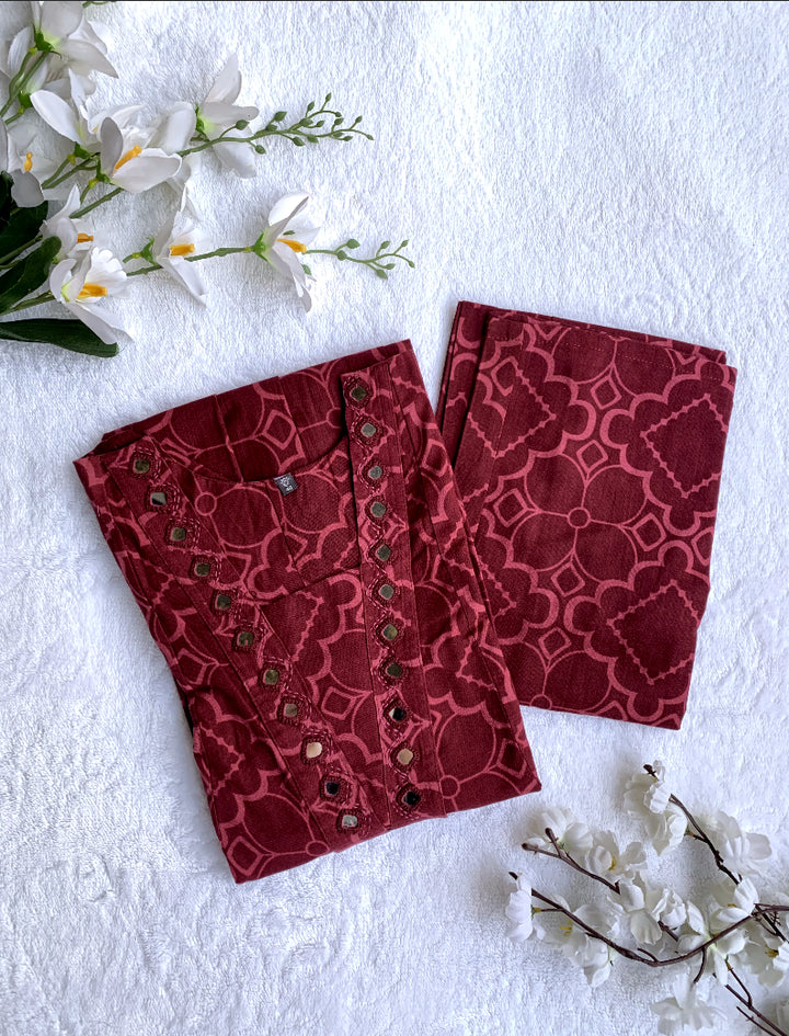 Step into effortless elegance with this beautifully designed printed cotton kurta set. Crafted from premium-quality cotton fabric, this outfit ensures all-day comfort with a graceful style. The kurta features a stunning geometric-inspired print and a flattering A-line silhouette that flows beautifully. The neckline is adorned with delicate mirror work detailing, adding a subtle sparkle to your look. Paired with matching wide-leg pants, this ensemble offers a perfect blend of traditional charm and contemporary appeal. Ideal for casual outings, festive gatherings, or office wear, this set promises both comfort and sophistication.